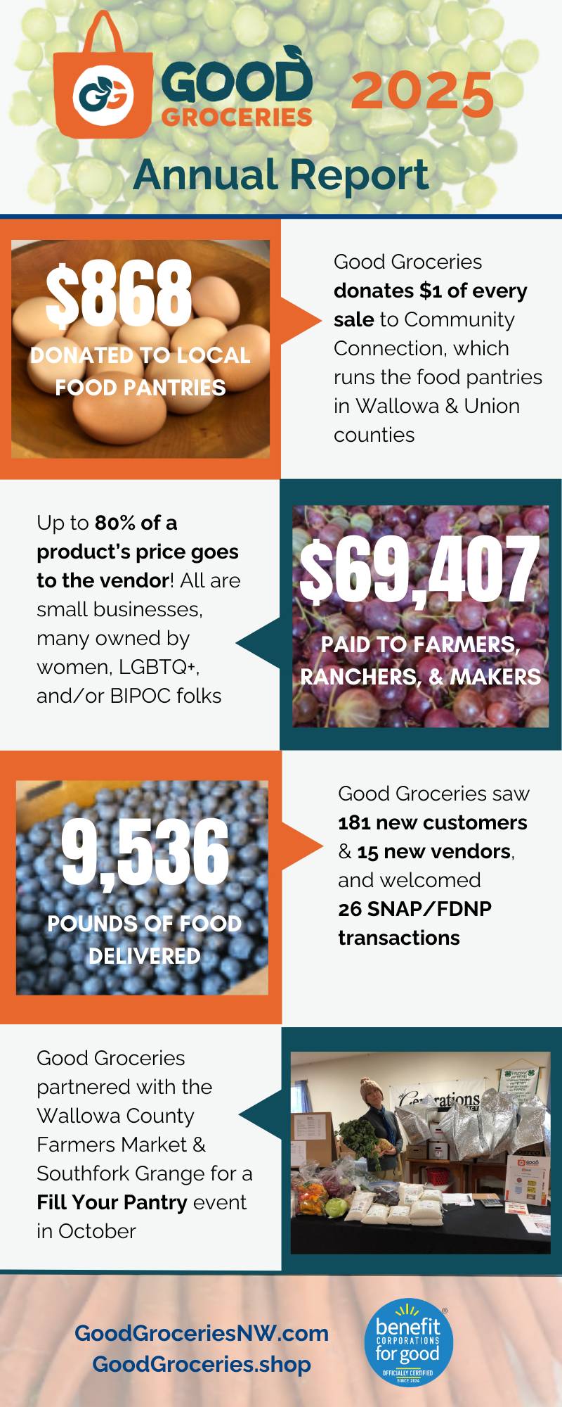 Good Groceries LLC (GG) is a certified Oregon B Company based in Wallowa County that delivers local meat, produce, and household goods from human-scale farmers, ranchers, fishers, and micro-manufacturers from the Pacific Northwest to homes and workplaces.