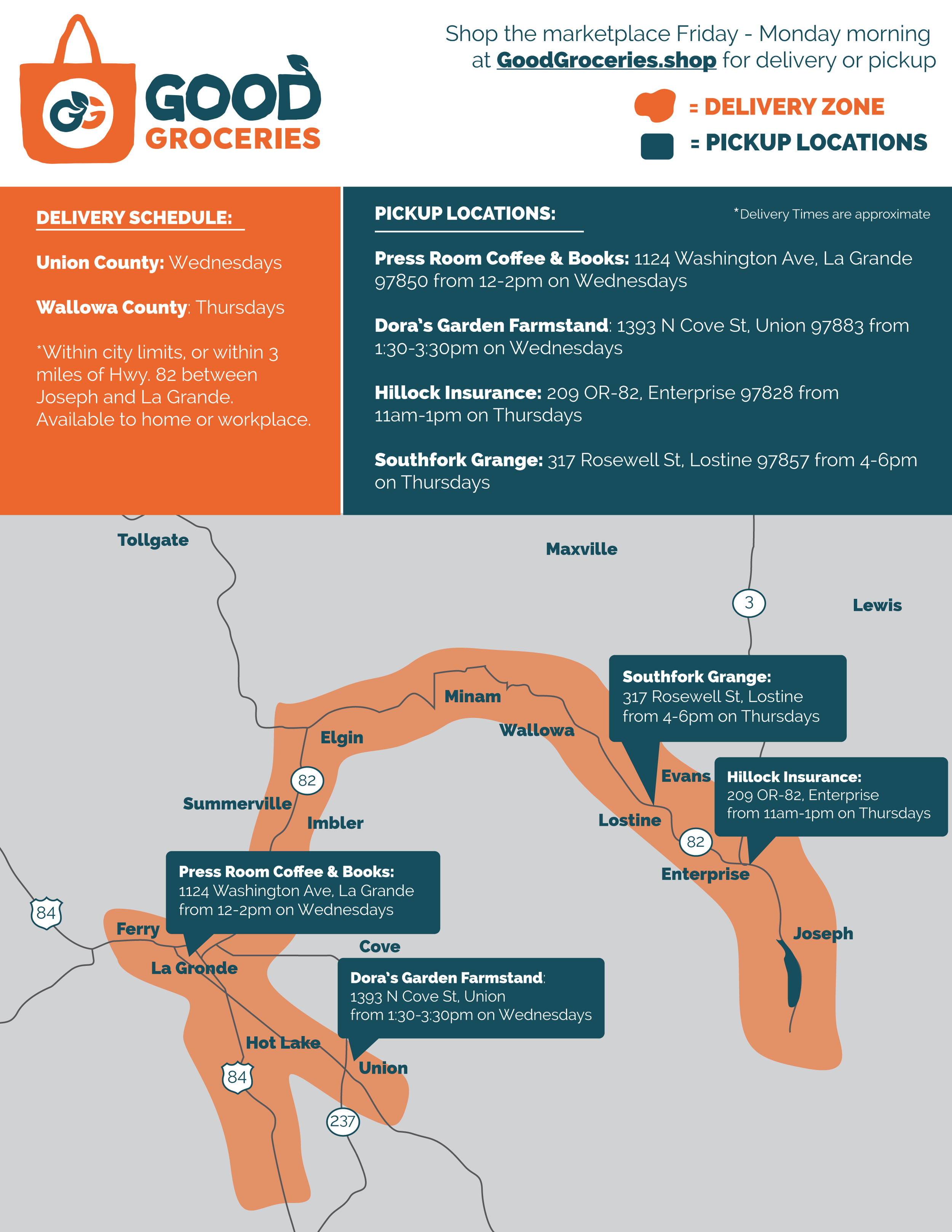 *Within city limits, or within 3 miles of Hwy. 82 between Joseph and La Grande. Available to home or workplace.